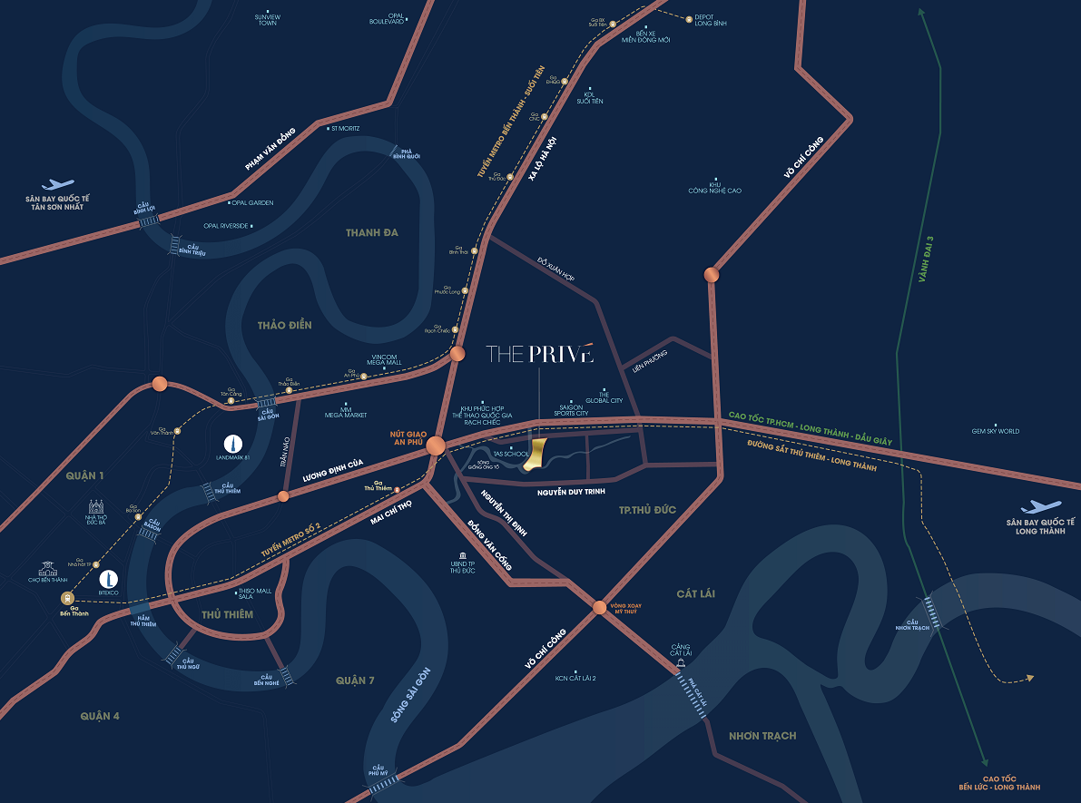 Không chỉ thừa hưởng trọn vẹn nhịp phát triển sôi động của lõi trung tâm mới, The Privé còn sở hữu hệ thống giao thông hiện đại khi nằm ngay “lõi TOD tỷ đô” nghĩa là mô hình phát triển đô thị theo định hướng giao thông công cộng. Dự án gần nút giao An Phú, ga metro Thủ Thiêm, kết nối nhanh với cao tốc TP.HCM – Long Thành – Dầu Giây, đại lộ Mai Chí Thọ, xa lộ Hà Nội, Vành đai 3 và tuyến metro số 2. Từ The Privé chỉ mất 7 phút để vào lõi trung tâm thành phố qua hầm Thủ Thiêm.