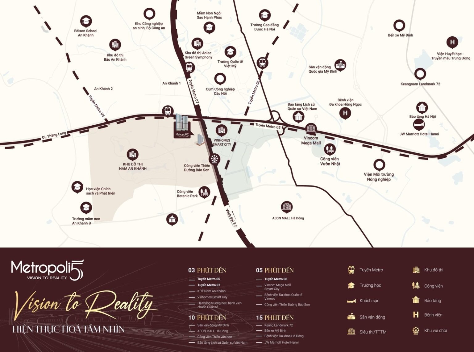Metropoli5 Nam An Khánh nằm giữa hệ sinh thái đô thị hiện đại: Vinhomes Smart City, Mailand Hanoi City Bắc An Khánh, Geleximco Lê Trọng Tấn – tạo nên một vùng đô thị năng động, đa dạng tiện ích và giá trị gia tăng bền vững. Với 4 tuyến giao thông tỷ đô cùng hạ tầng Metro, vị trí này được ví như “mỏ vàng” đầu tư của khu Tây, hứa hẹn trở thành trung tâm kết nối – thương mại – dịch vụ sầm uất trong 5 năm tới.