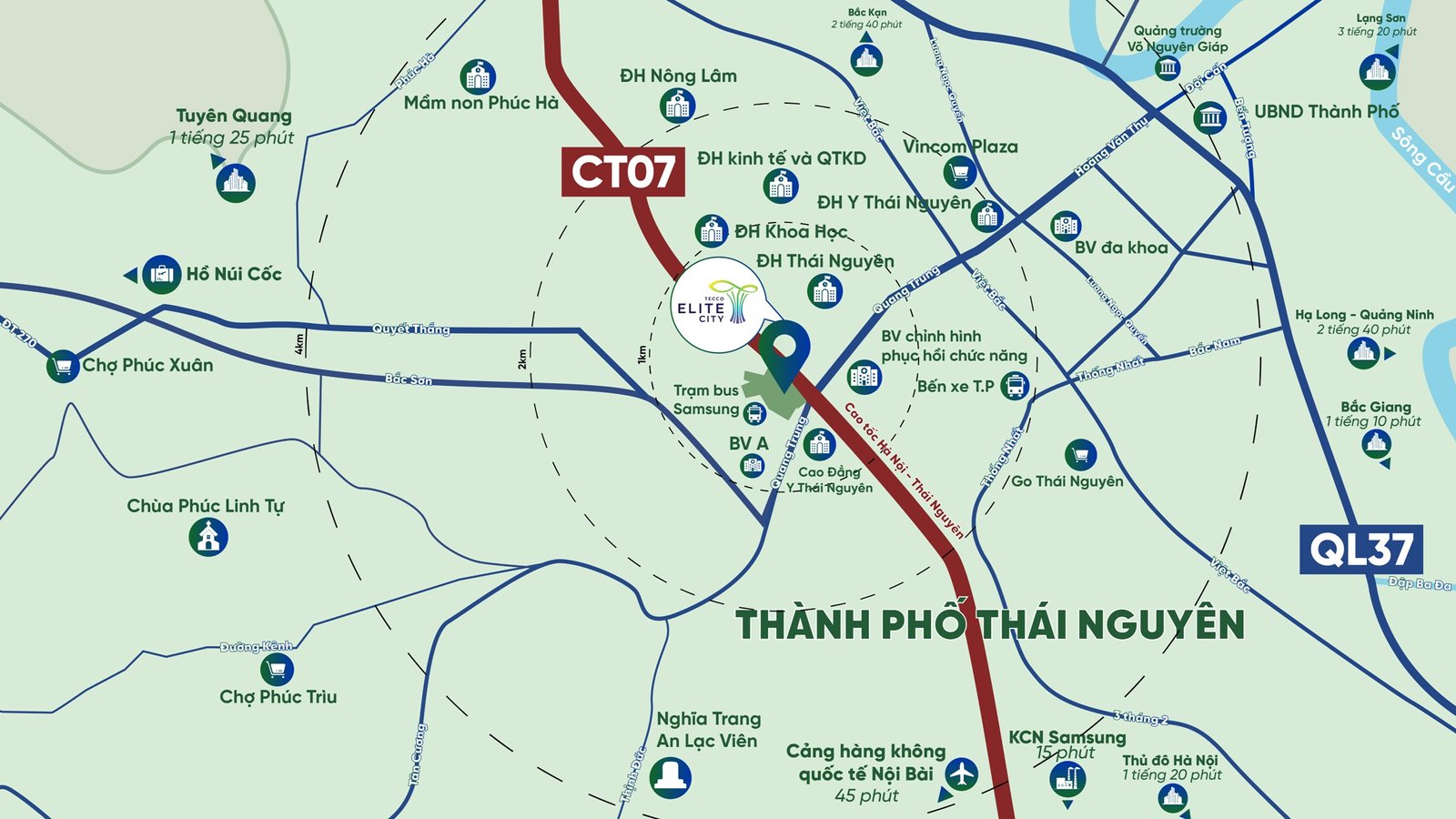 • Trong bán kính dự án 1km đầy đủ tiện ích trường học, bệnh viện, cơ quan hành chính của thành phố như bệnh viện A, bến xe thành phố, Đại học Thái Nguyên,…