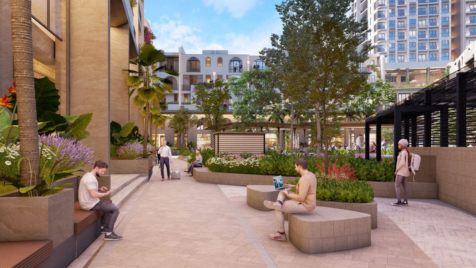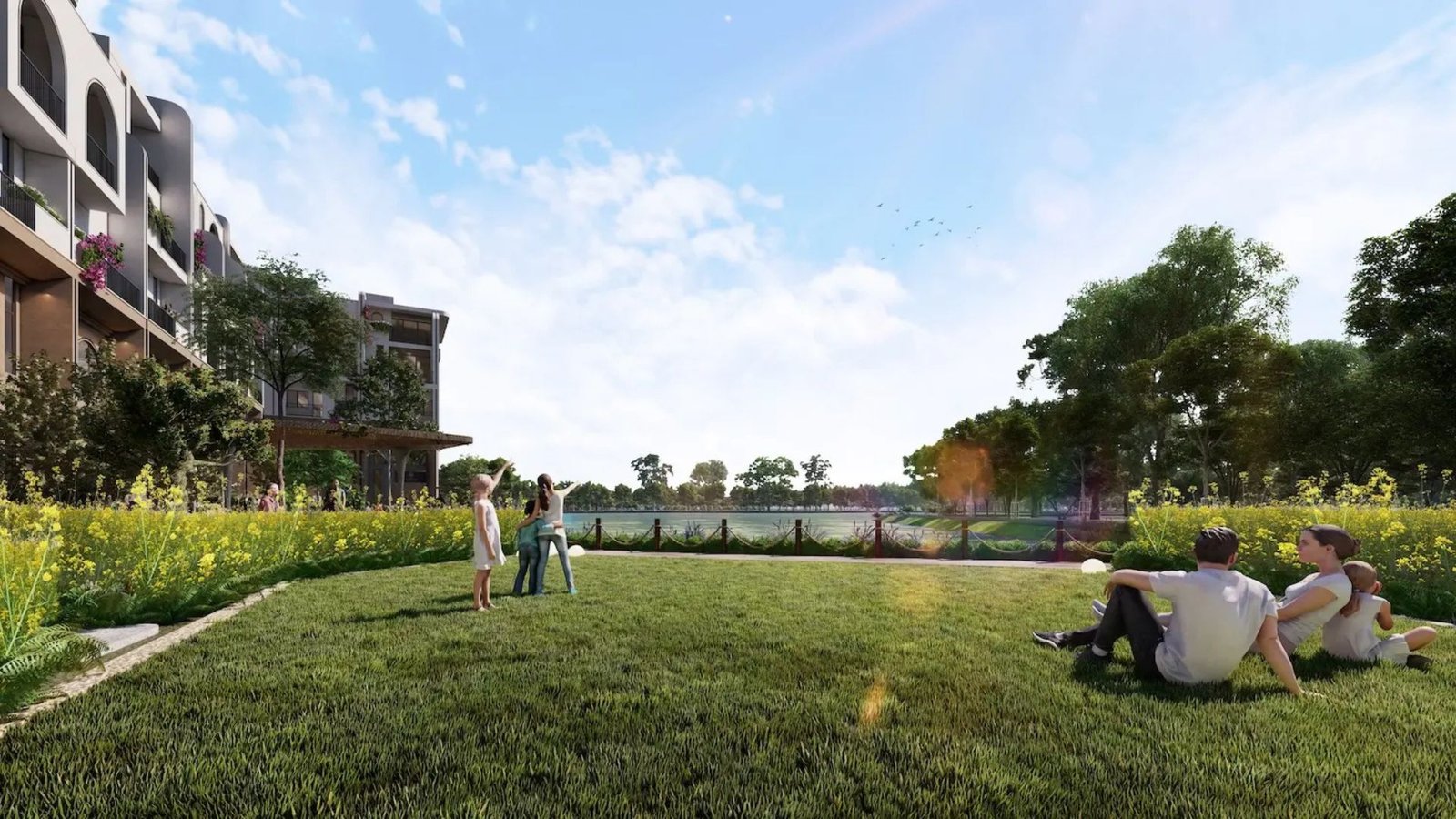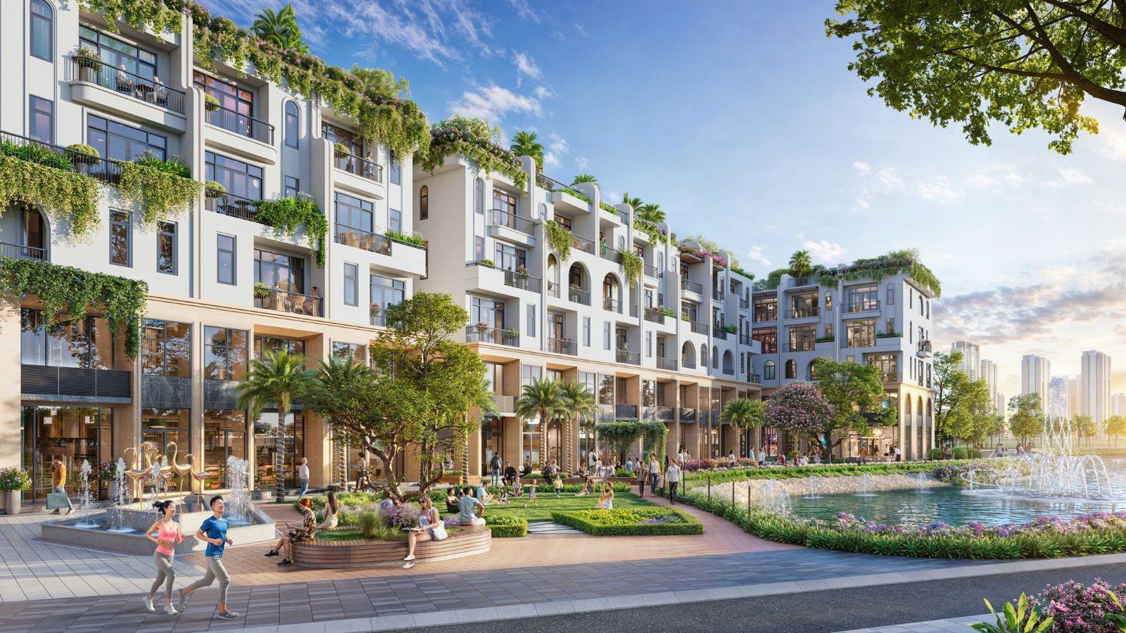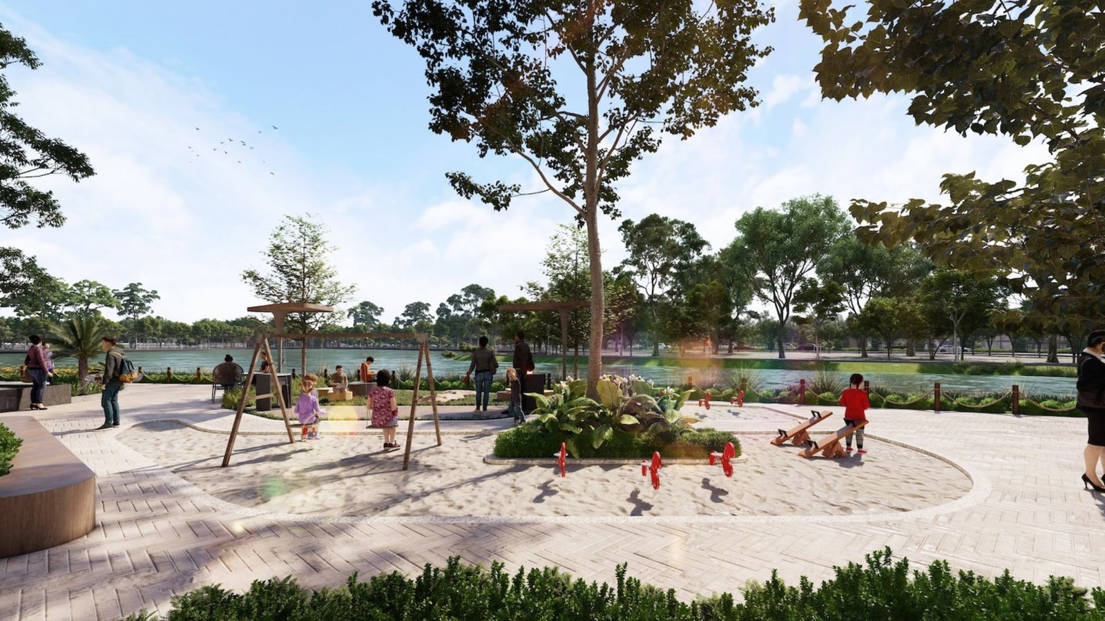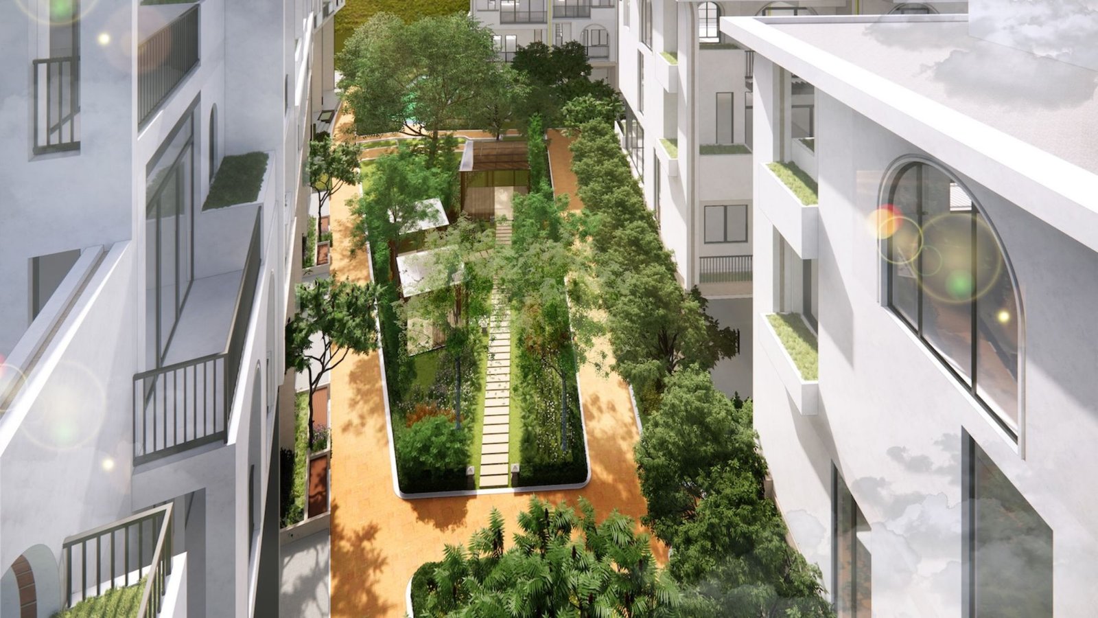 Hơn 50% diện tích dự án dành cho cây xanh và mặt nước, được bố trí đan xen giữa các phân khu, mang đến không gian sống thoáng đãng, ngập tràn ánh sáng và gió trời tự nhiên cho từng căn biệt thự, nhà phố.