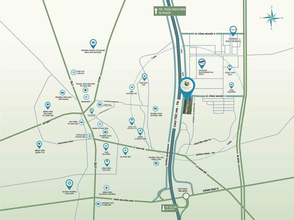 Yên Bình K-Town nằm tại trung tâm Phổ Yên – vùng kinh tế năng động phía Nam Thái Nguyên, liền kề các khu công nghiệp lớn và trục giao thông huyết mạch, đón đầu làn sóng phát triển đô thị và dòng vốn FDI.
