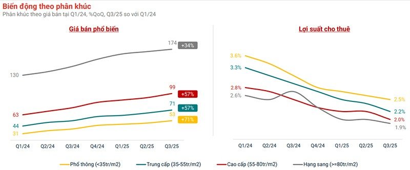 Theo báo cáo của CBRE, giá chào bán chung cư sơ cấp tại Hà Nội trung bình trong quý III đã vượt mốc 90 triệu đồng/m2 thông thủy (chưa bao gồm VAT và kinh phí bảo trì, chiết khấu), cao hơn quý trước 16% và cao hơn 41% so với cùng kỳ năm trước, cao hơn mức giá trung bình của thị trường căn hộ tại TP.HCM trong quý này. Hầu hết trong số đó đang trong giai đoạn mới khởi công hoặc đang xây dựng tầng thấp và dự kiến bàn giao sau 2-3 năm tới.